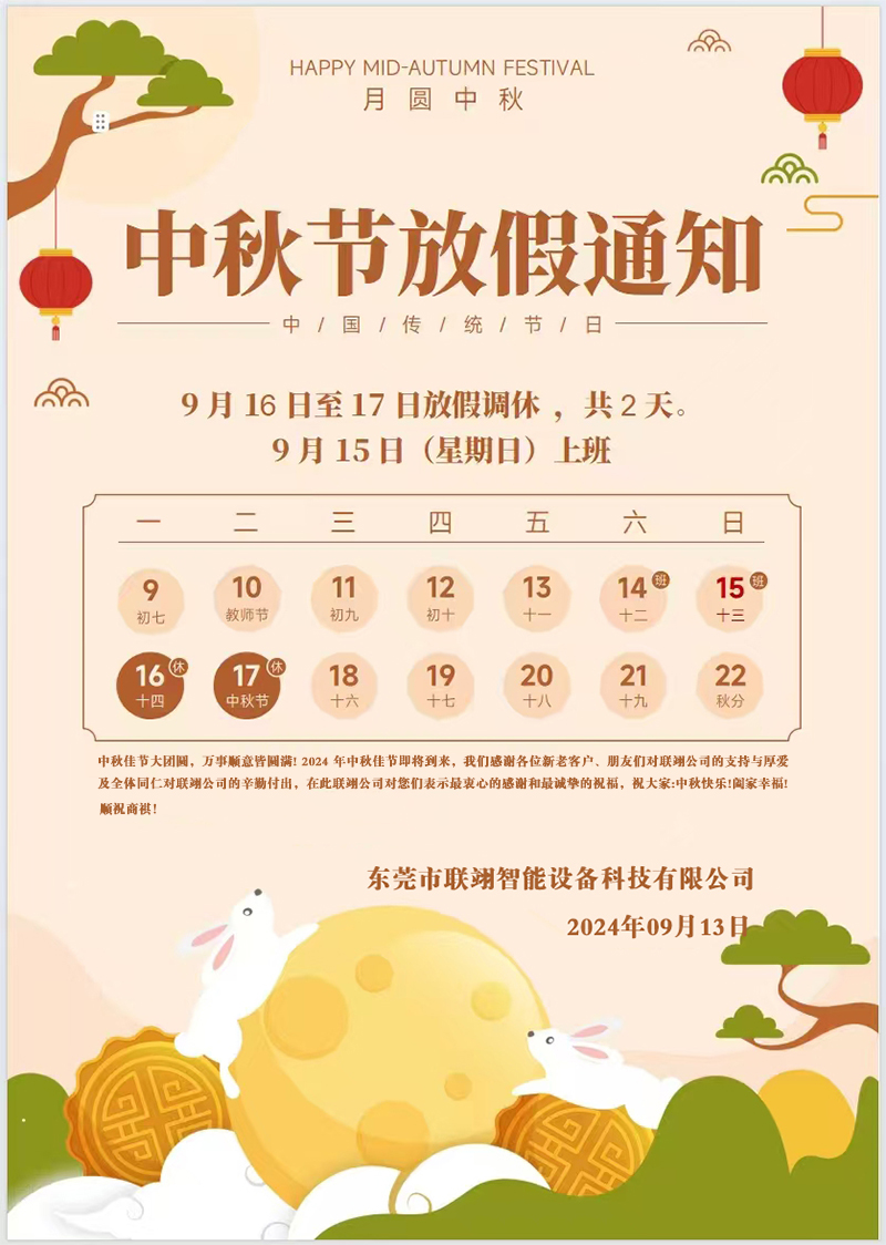 中秋佳節大團圓,萬事順意皆圓滿! 2024 年中秋佳節即將到來,我們感謝各位新老客戶、朋友們對聯翊公司的支持與厚愛及全體同仁對聯翊公司的辛勤付出,在此聯翊公司對您們表示最衷心的感謝和最誠摯的祝福,祝大家:中秋快樂!闔家幸福!